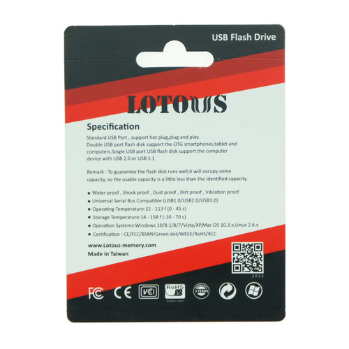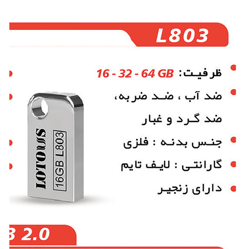 لوتوس با در بر داشتن سهم عمده ای از بازار USB Flash و Memory Cards مفتخر است که بهترین کیفیت،بالاترین تنوع در محصولات و معتبرترین خدمات پس از فروش را به مشتریان خود ارائه میدهد. فلش مموری لوتوس مدل L803 با سیستم عاملهای ویندوز Windows 8.1, Windows 8, Windows 7, Windows Vista , Mac OS 9.0 and above, Linux 2.4 سازگار است. این ذخیرهکننده از سرعت خواندن 50 مگابایت برثانیه و سرعت نوشتن 20 مگابایت برثانیه برخوردار است و از تکنولوژی پشتیبانی از حالت صرفه جویی در انرژی بهره میبرد.فلش مموری لوتوس مدل L803 علی الرغم استفاده از رابط USB 2 ،سرعت انتقال بالایی دارد که به میزان قابل توجهی عملکرد انتقال اطلاعات را بهبود داده است. همچنین این محصول با رابط USB 2.0 و USB 1.1 سازگار است. جنس بدنه این فلش مموری از فلز می باشد. از مزیت های خوب این فلش می توان به ضدآب، ضد ضربه، ضد گرد و غبار اشاره کرد. این ویژگی ها توانسته فلش لوتوس را در بین کاربران محبوب کند. فلش لوتوس از تکنولوژی MICRO COB بهره می برد که نسبت به فلش های معمولی از قابلیت و ویژگی های منحصر به فردی برخوردار می باشد.