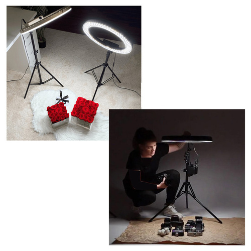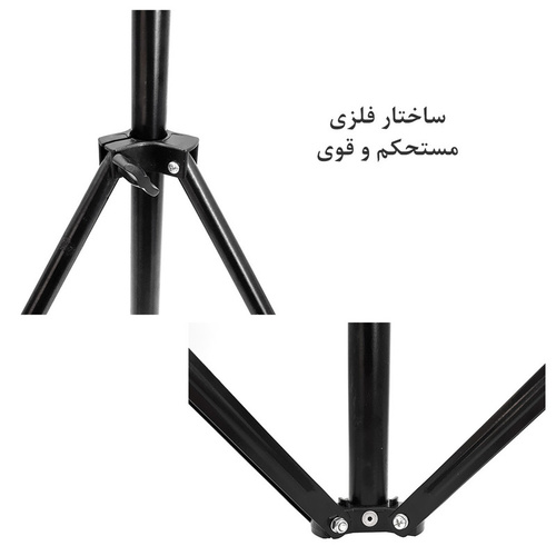 - تنظیم زاویه و مانت قابل نصب: با استفاده از پیچ تنظیم موجود روی رینگ لایت، میتوانید زاویه آن را به دلخواه تنظیم کنید. مانت این رینگ لایت مناسب نصب بر روی انواع سهپایههای نورپردازی است و سهپایه موجود بر روی آن قابل تنظیم تا ارتفاع 210 سانتیمتر میباشد.